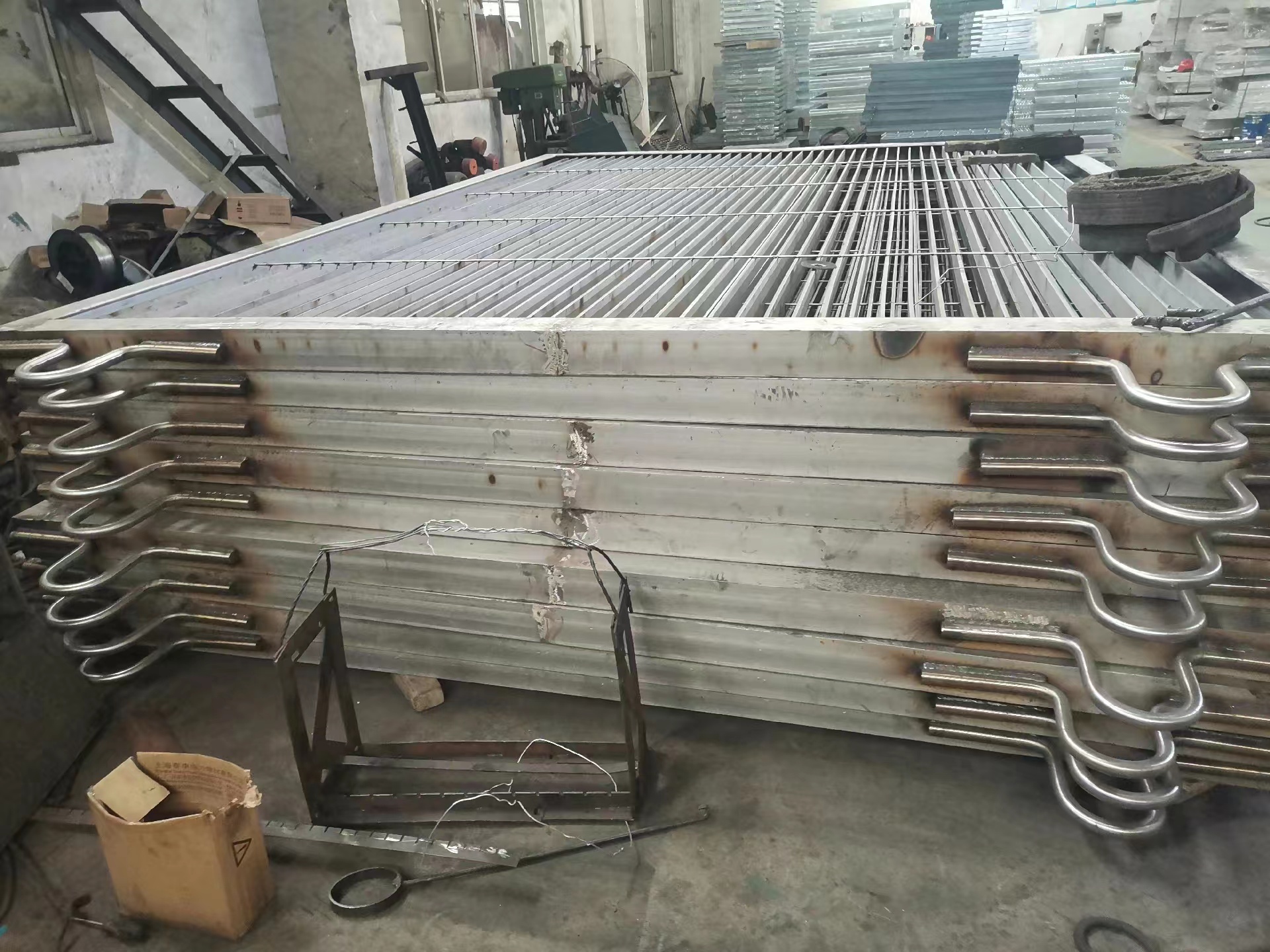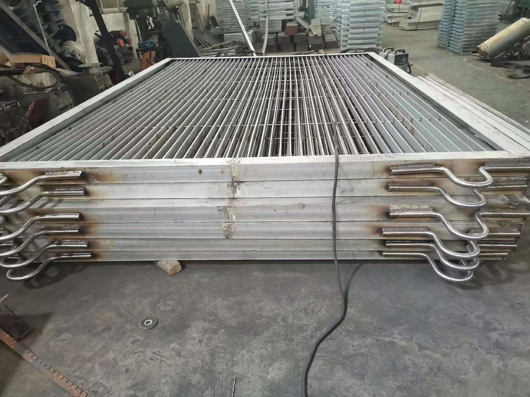 机器压焊使用高压电阻压焊机,机械手自动将横杆横放在均匀排列的扁钢上,通过强大的电焊功率和液压力将横杆压焊入扁钢内,从而可以得到焊点坚固,稳定性和强度极高的钢格板。